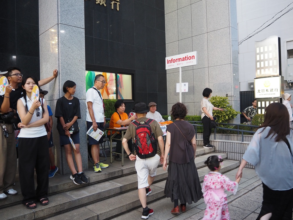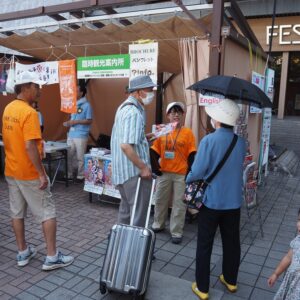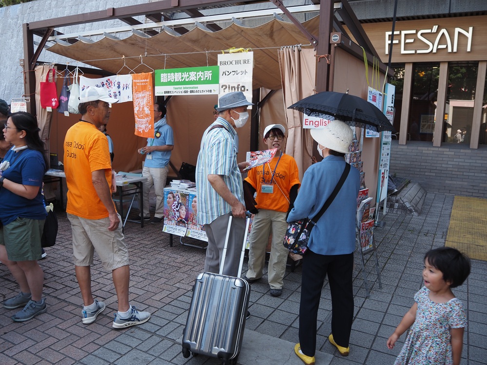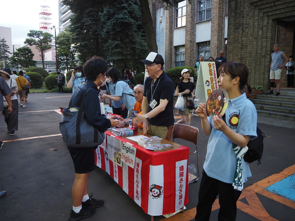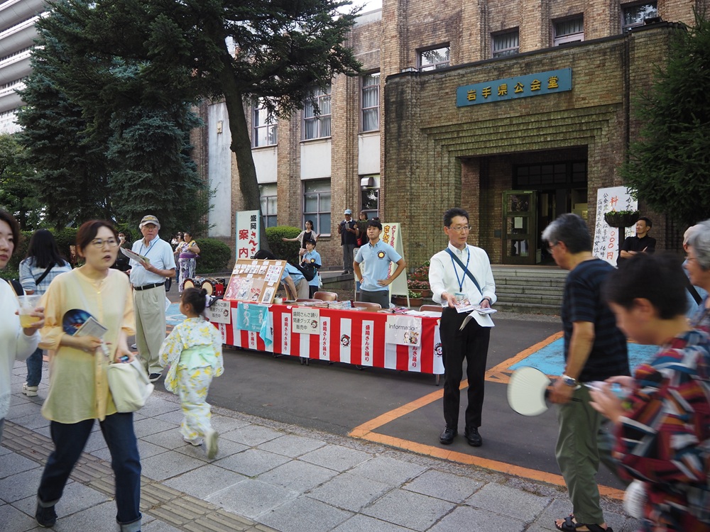 今年も実行委員会からの依頼で、盛岡駅前、北銀本店前、公会堂前の3カ所で、外国 人のお客様を中心に、さんさ踊りの会場やプログラムについて、またトイレや有料観 覧席の場所についての案内などを行いました。4日間延べで、駅前8名、北銀前16名、 公会堂前8名の会員が従事しました。 Sansa Dance Festival season has come. Our members worked at three information booths for mainly tourists from abroad.