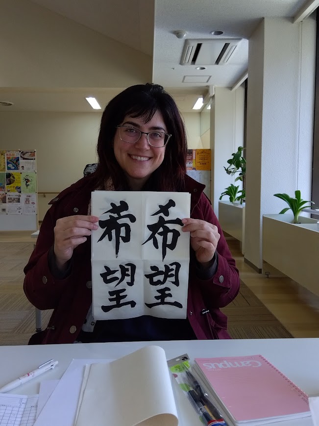 カナダのJulie さん、日本語や日本の文化を学ぶことを目的にした三度目の盛岡来訪です。 盛岡善意ガイドの会のメンバーとは、すっかり仲良しになり、平泉や八幡平への小旅行、 家庭料理を作って食べたり、初めてのじゃじゃ麺やわんこそばを堪能しました。 座禅、お習字、日本語の勉強と充実した2週間を過ごしました。 彼女の墨で書いた「希望」がとても美しく、またの再開を願うものです。